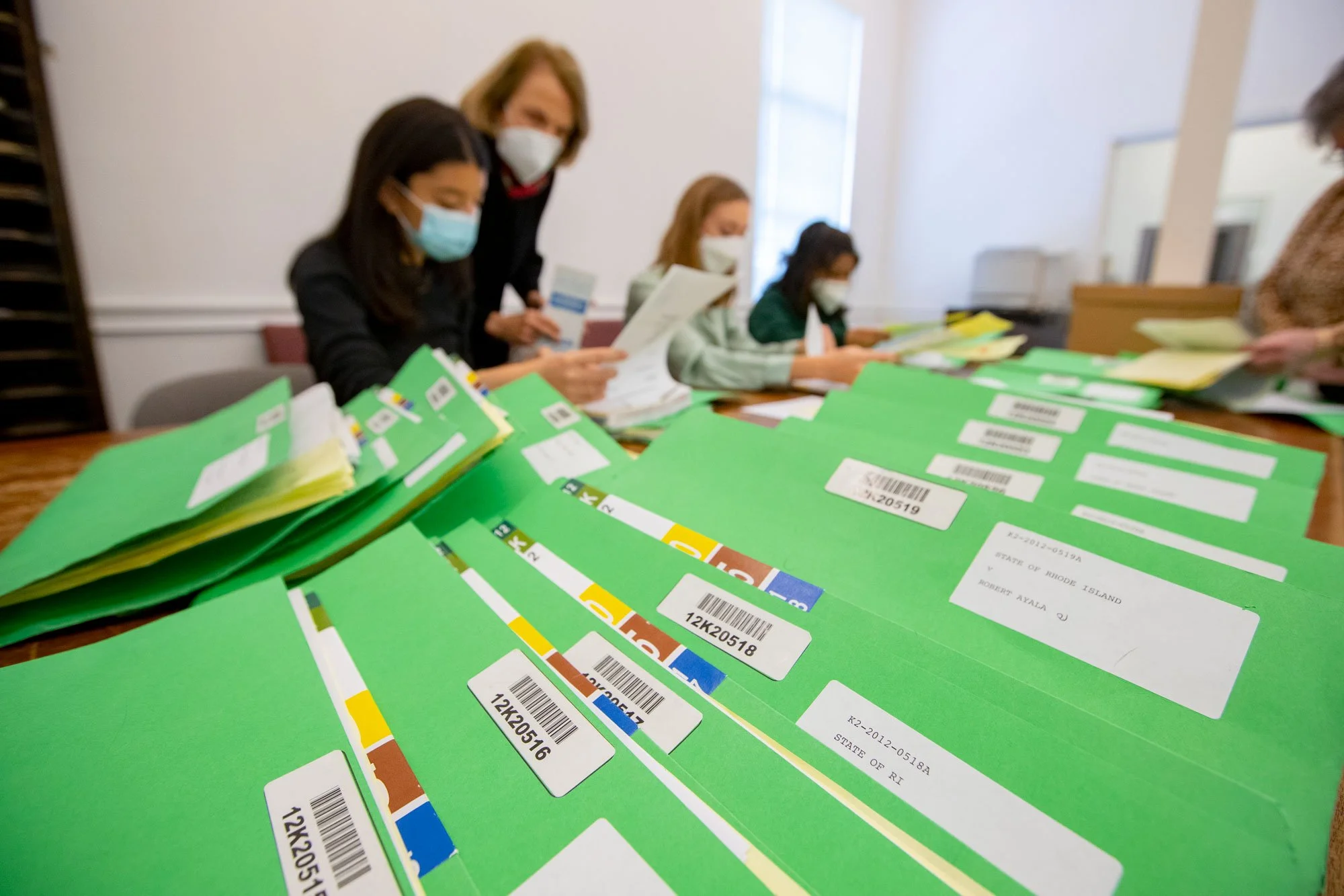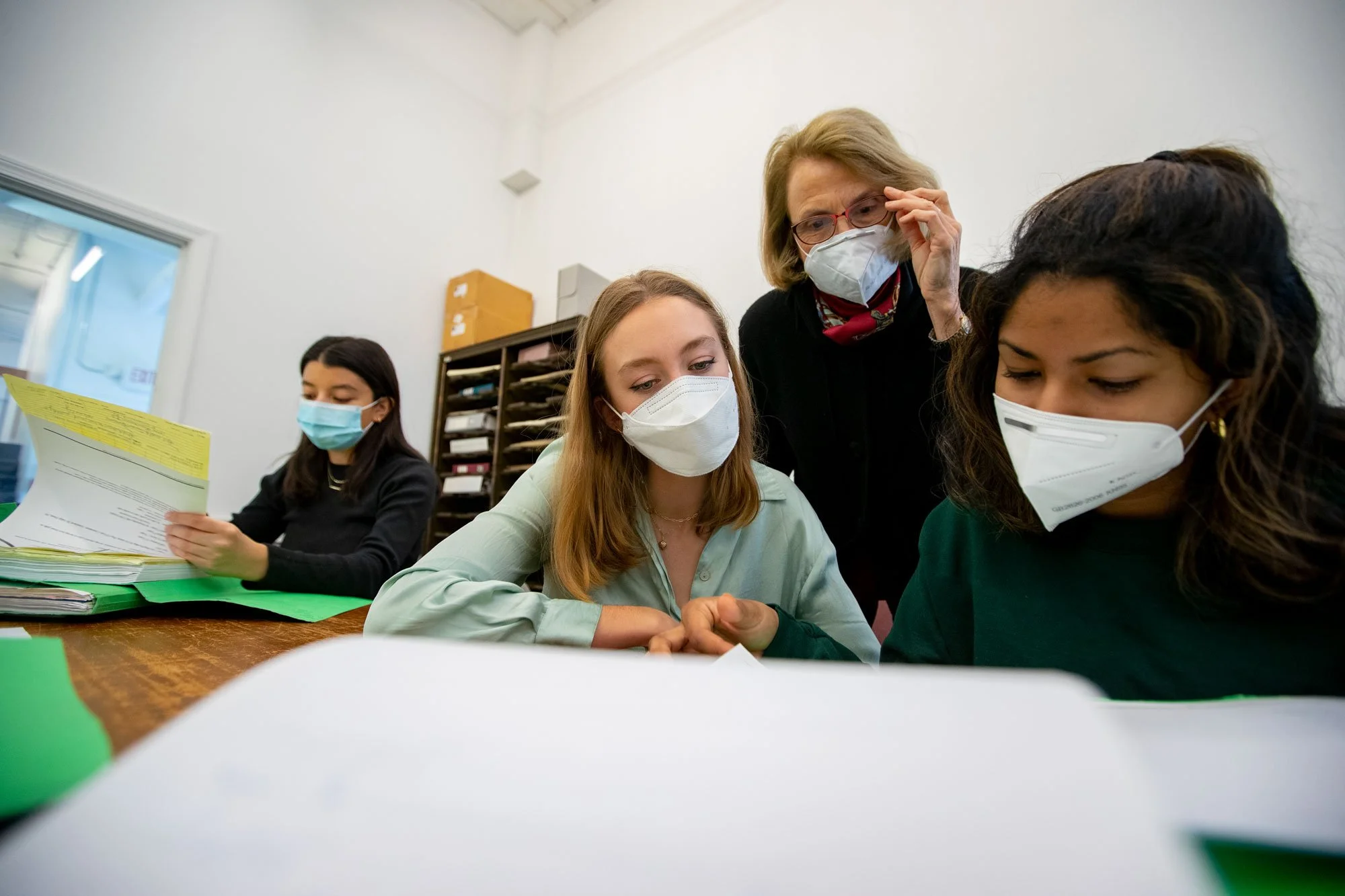 Pulitzer Prize-winning journalist Tracy Breton (standing), and Brown students Li Goldstein, Olivia George and Gaya Gupta (left to right) review files at the Rhode Island Judiciary Records Center.